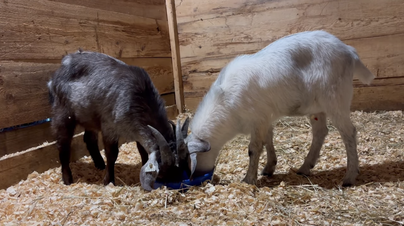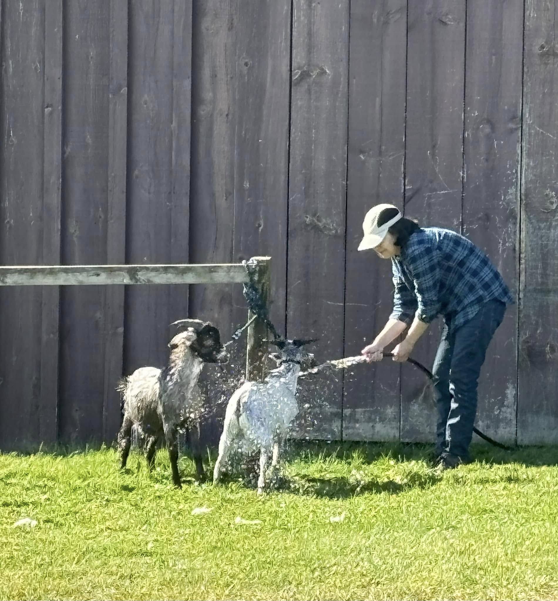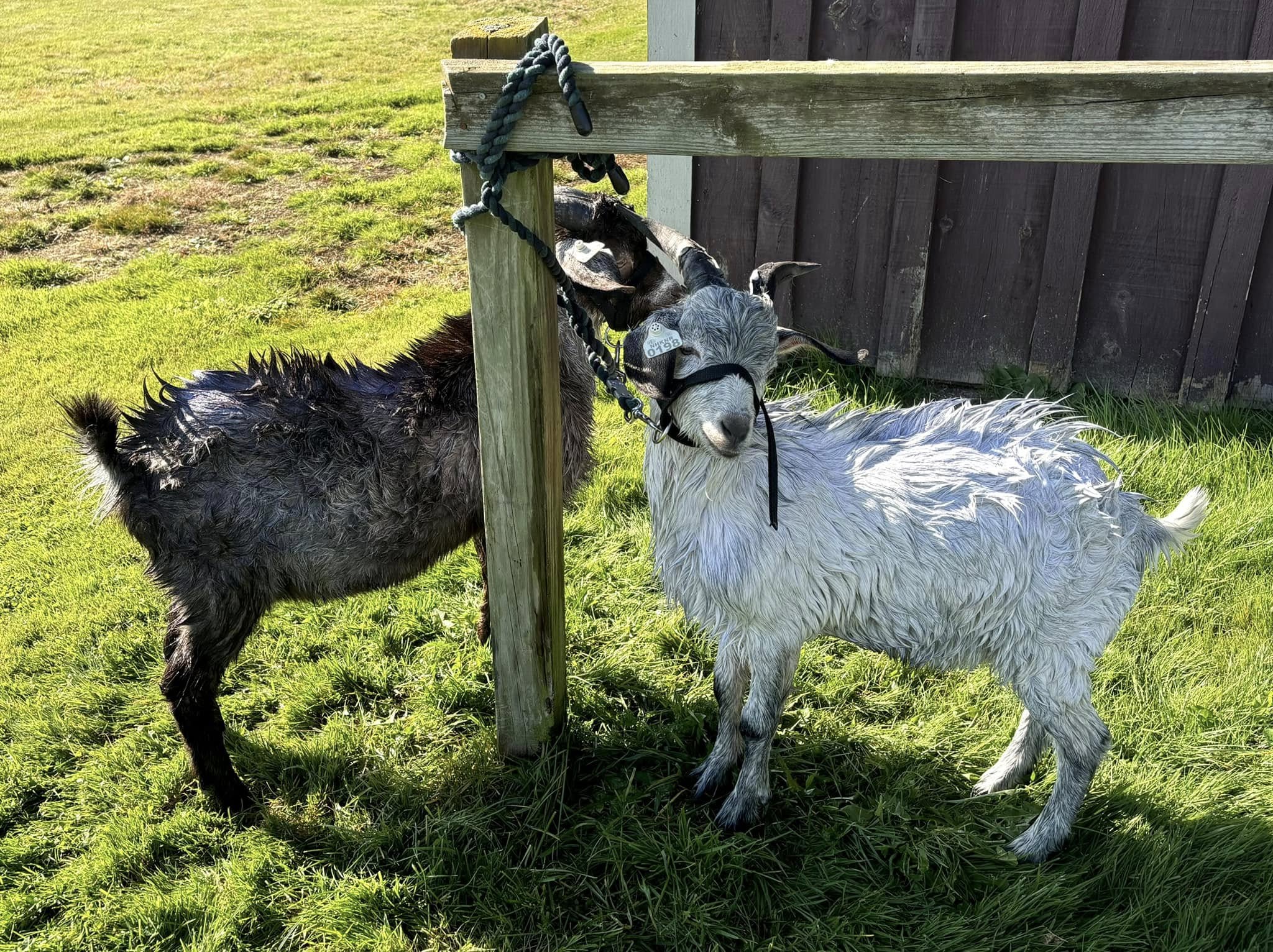 This week had some warm weather, so the boys got a spa day with their favorite UltraCruz Equine Bright White Shampoo (not sponsored, we just love they way this purple shampoo makes gray goats sparkle). This was Aston and Martin’s first bath ever! They watched David enjoying each step of the process first, before they tried it themselves.