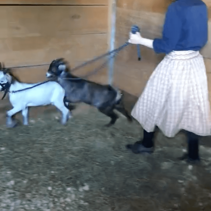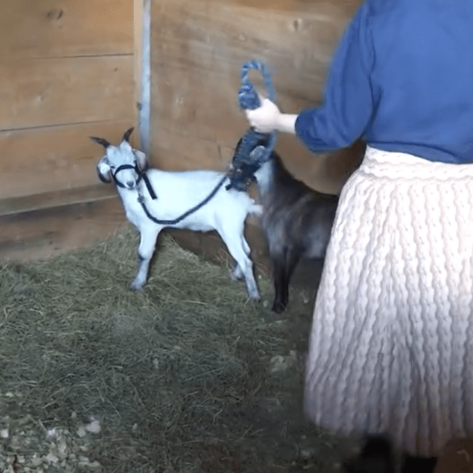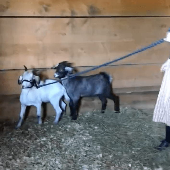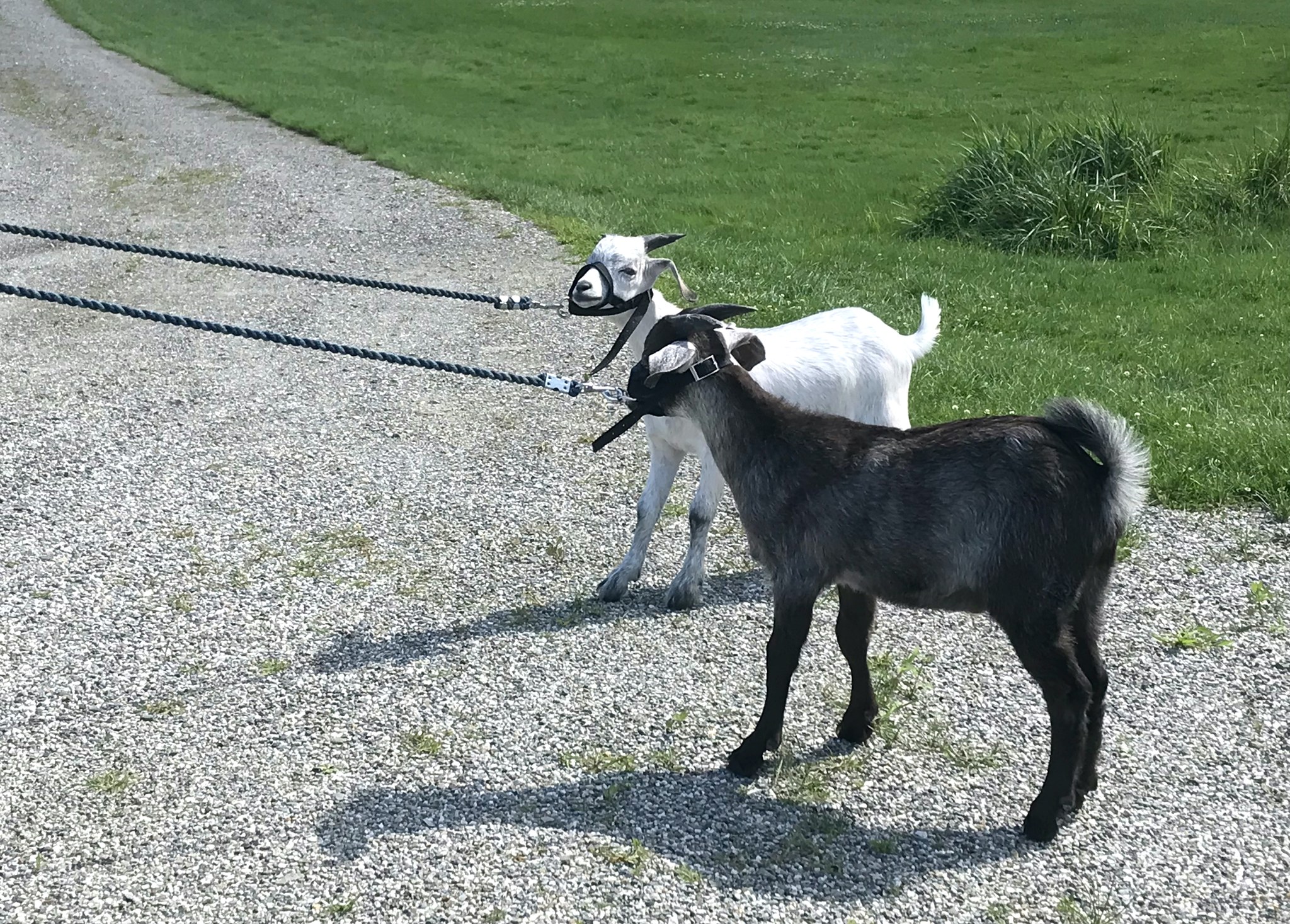 With goats, when trying new equipment for the first time, a slight fight response is nothing to worry about. The boys quickly realized there was no need to shake their halters and swipe at their lead ropes, and calmed down.