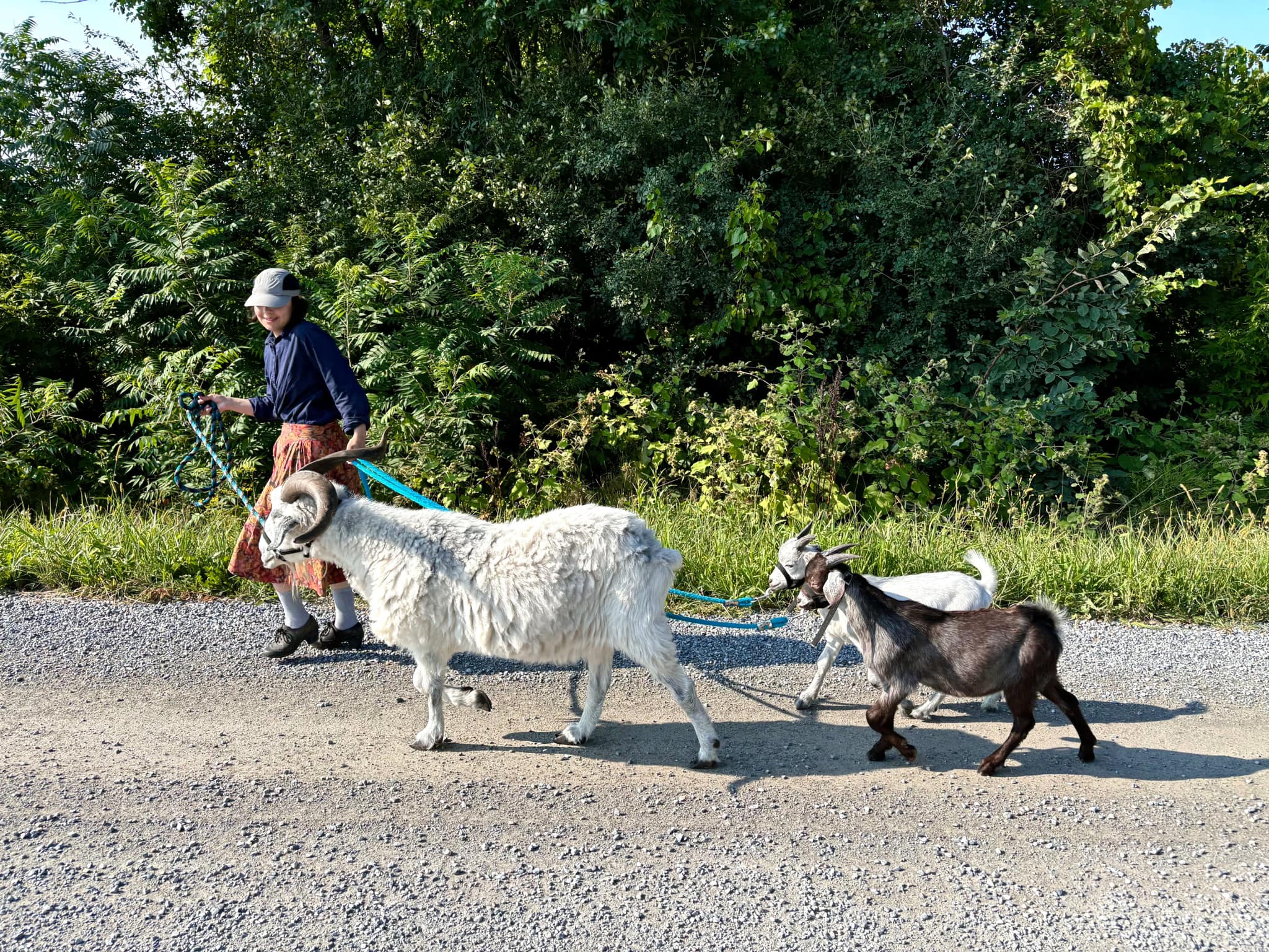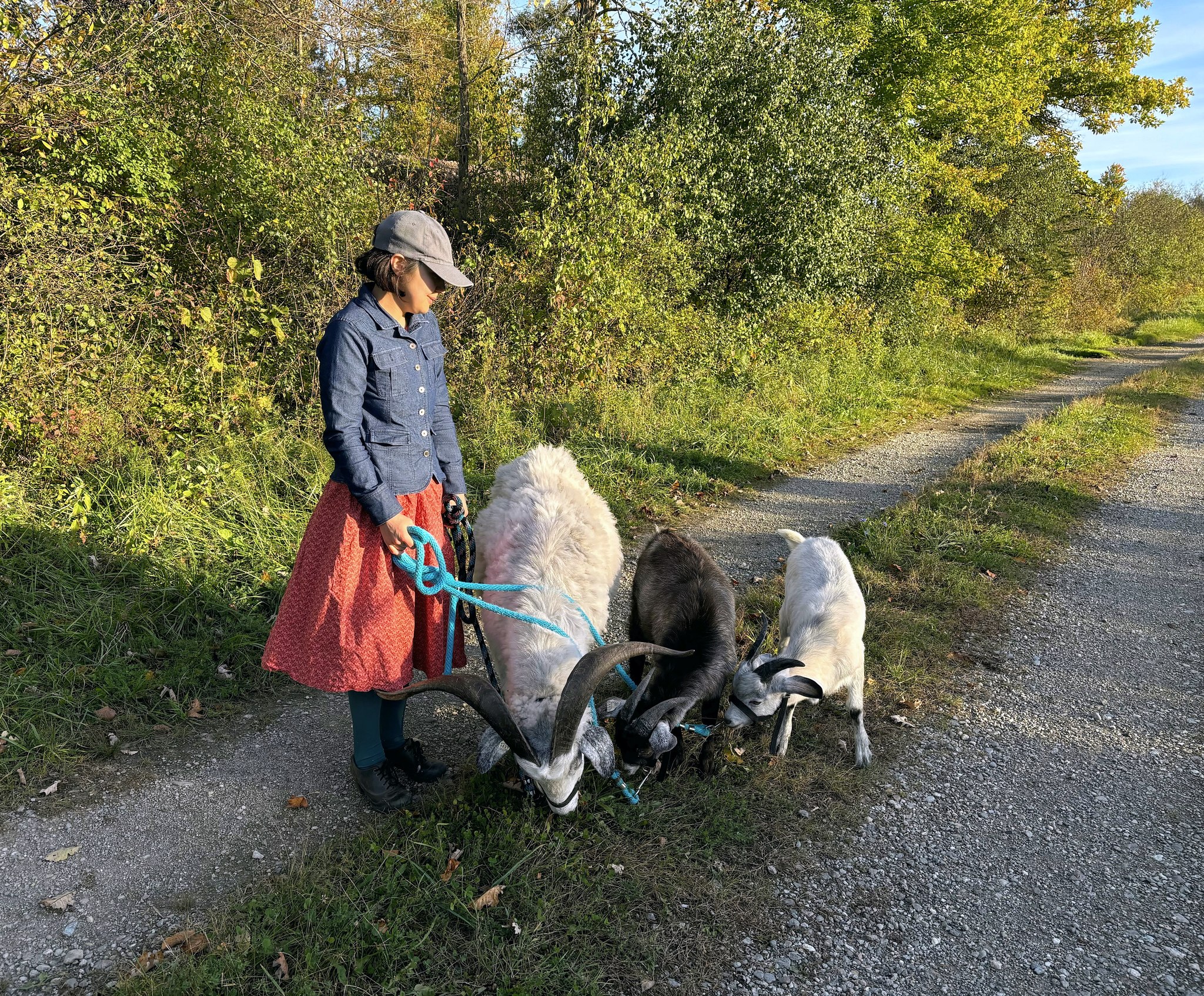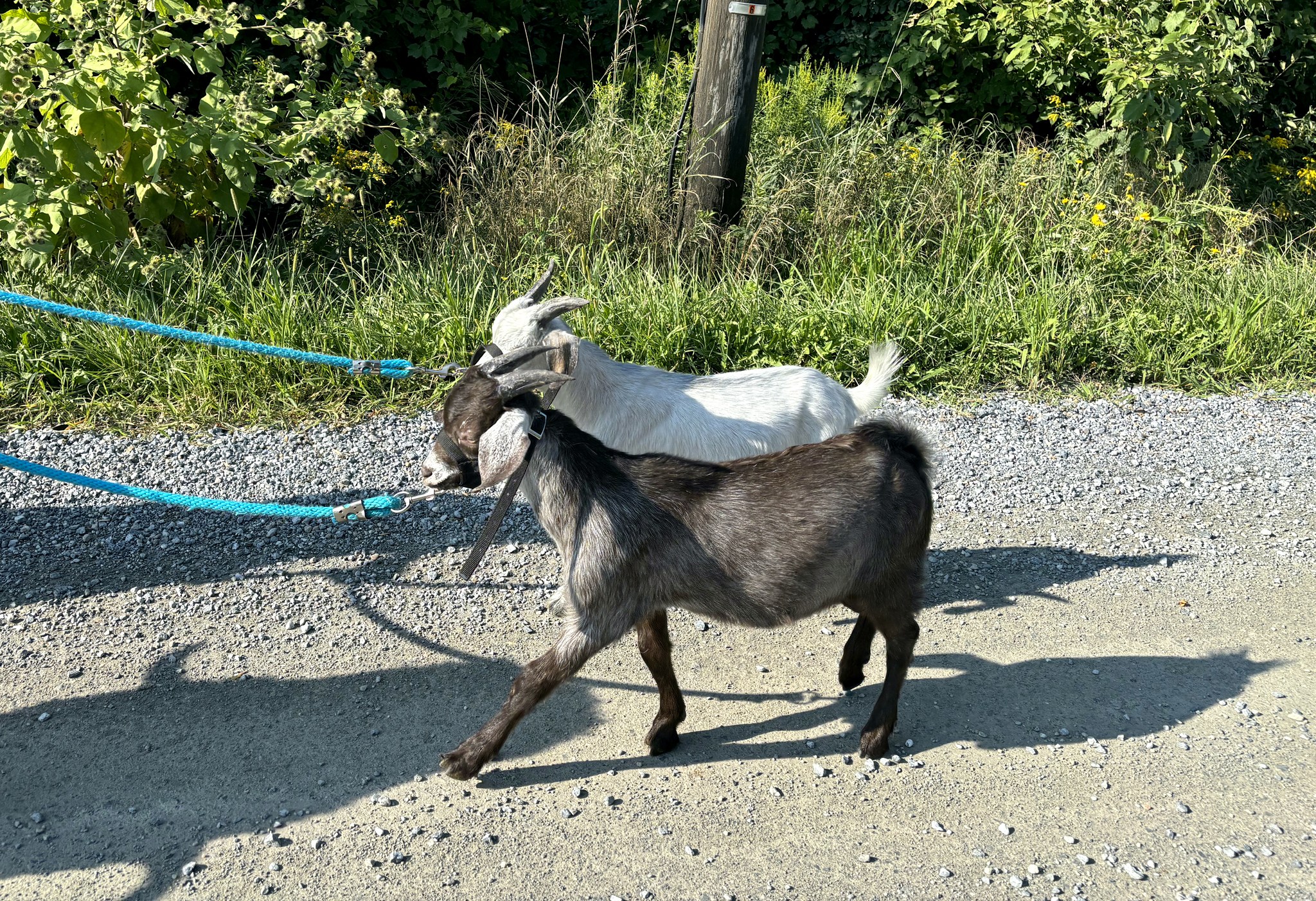 Aston is a very forward-moving goat, but his friend, Martin, has been a bit balky in training. They are very much a “brains & brawn” duo, and Martin is used to being the boss of his friend. It’s important for him to learn that he can ask to stop and stand without throwing his whole body against the lead rope. It’s the equivalent of learning polite language. Happily, our assistant trainer, David, was very willing to step in and help explain things to Martin.