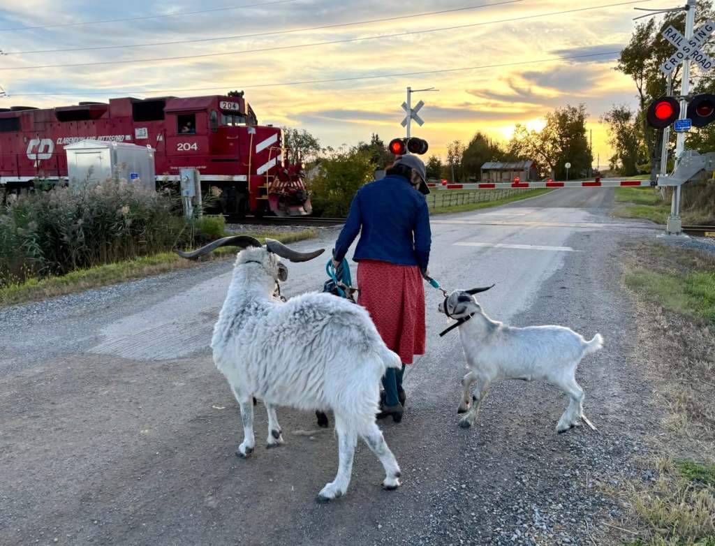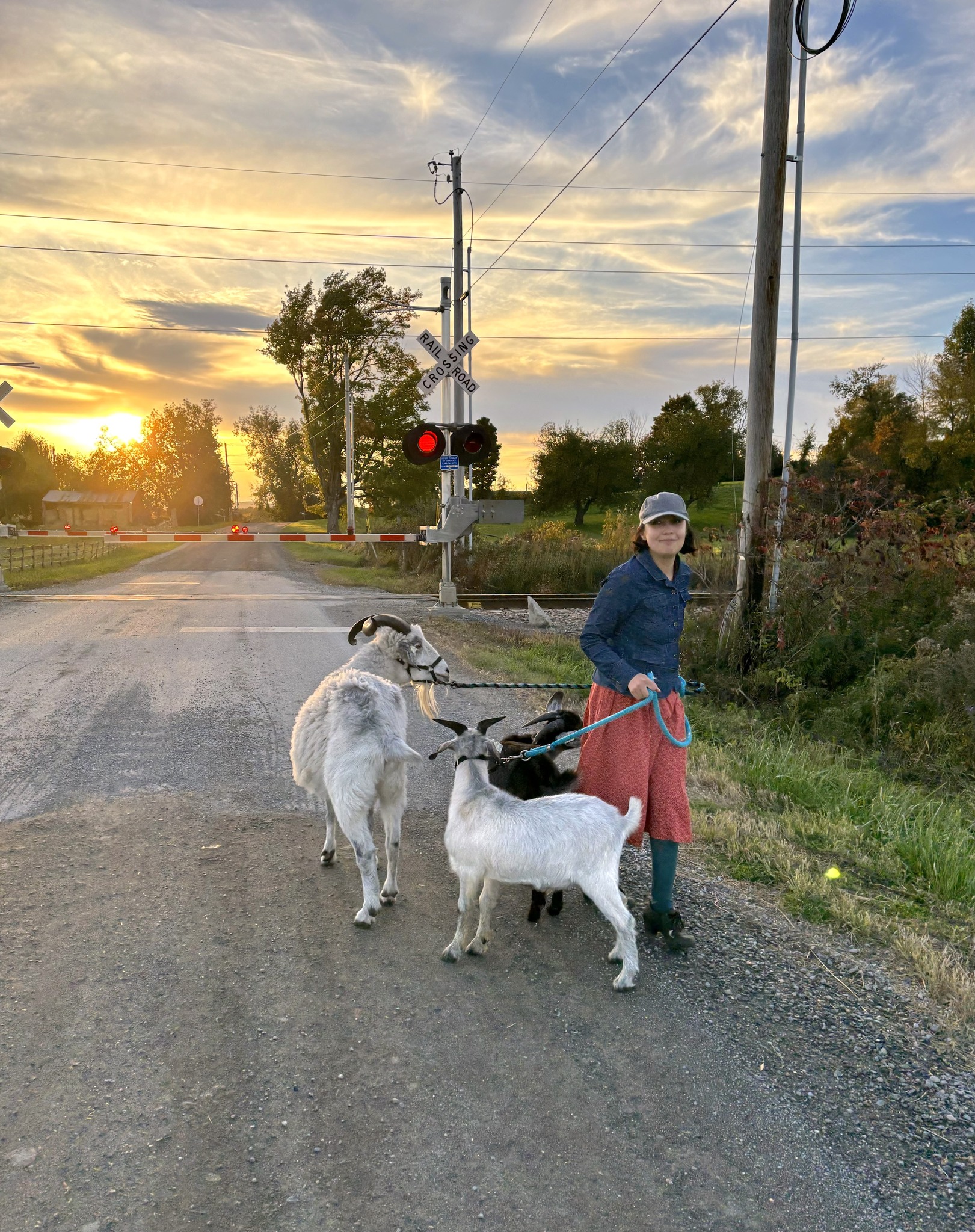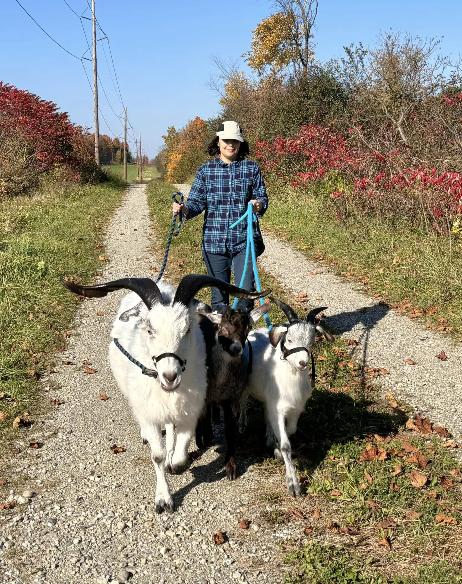 Aston is a very forward-moving goat, but his friend, Martin, has been a bit balky in training. They are very much a “brains & brawn” duo, and Martin is used to being the boss of his friend. It’s important for him to learn that he can ask to stop and stand without throwing his whole body against the lead rope. It’s the equivalent of learning polite language. Happily, our assistant trainer, David, was very willing to step in and help explain things to Martin.